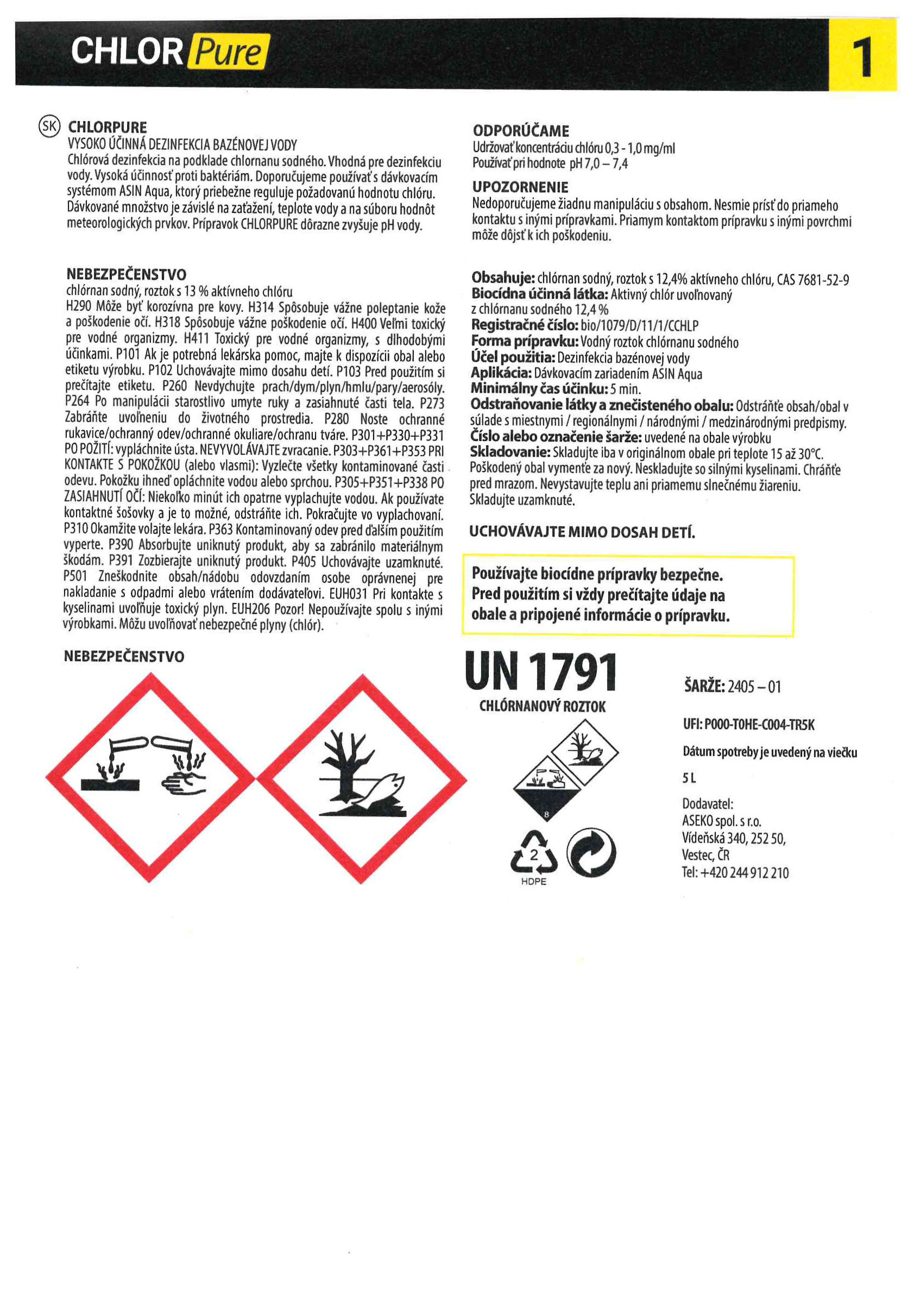 ASEKO Chlorpure 5 l je profesionálna tekutá dezinfekcia na báze vysoko koncentrovaného chlórnanu sodného, určená pre verejné aj súkromné bazény. Zabezpečuje efektívnu a rýchlu likvidáciu baktérií, vírusov, rias a plesní, čím udržiava hygienickú nezávadnosť vody. Prípravok je optimalizovaný pre automatické dávkovacie systémy, najmä pre stanice ASIN AQUA, kde zaisťuje presné a spoľahlivé riadenie dezinfekcie.