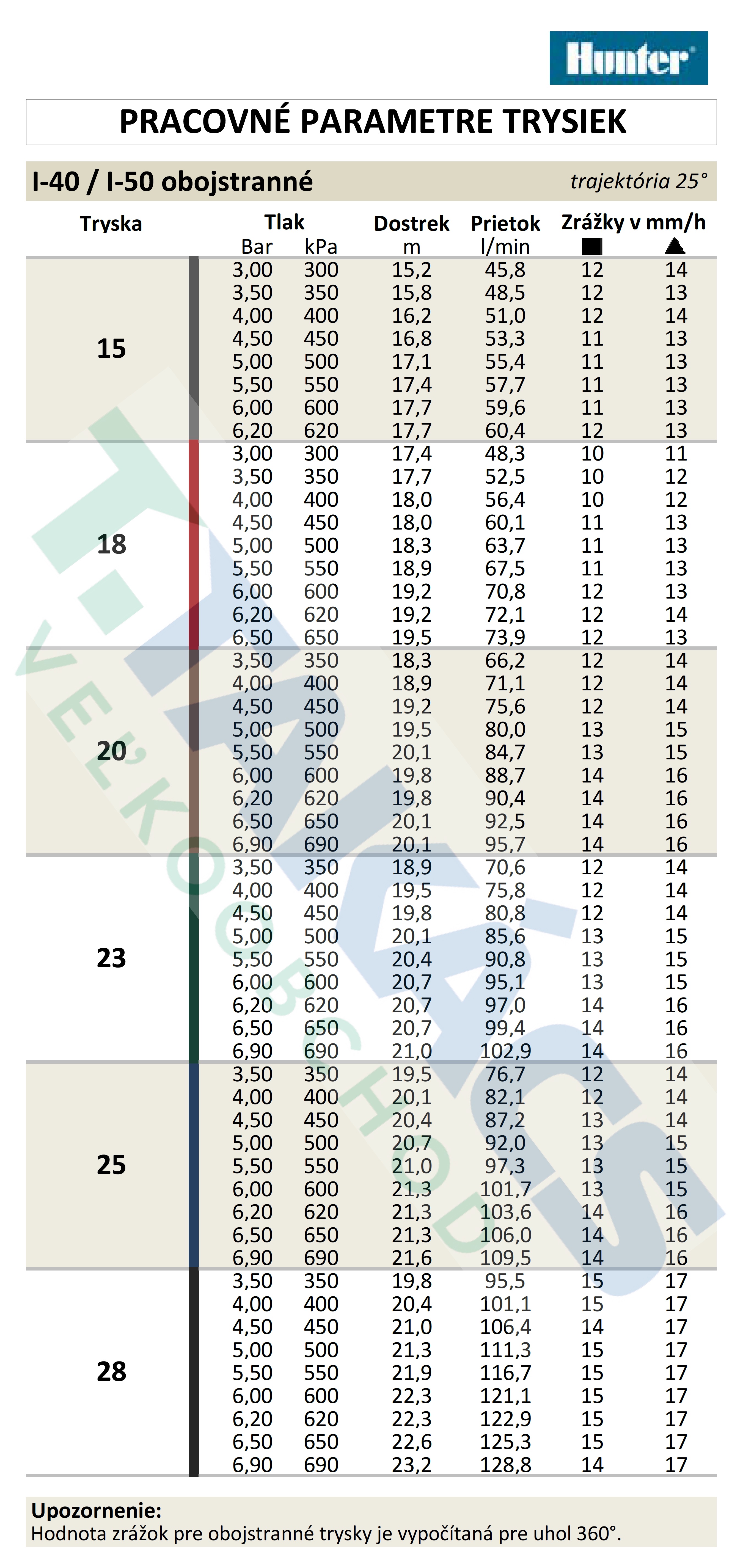 Špeciálna celokruhová verzia (Full Circle) modelu I-40 s protichodnými tryskami (Opposing Nozzle). Vďaka umiestneniu trysiek na opačných stranách veže dosahuje vynikajúcu rovnomernosť závlahy a maximálny dostrek až 23,2 m. Nerezový výsuvník a robustné telo sú ideálne pre centrálne umiestnenie na futbalových ihriskách a veľkých trávnatých plochách.