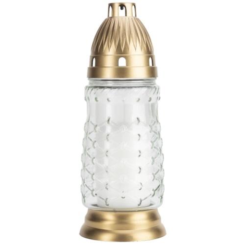 Sklenené náhrobné svetlo s vymeniteľnou náplňou s plastovým vekom a základňou. Obsahuje vložku s približnou dĺžkou horenia 45 hodín.