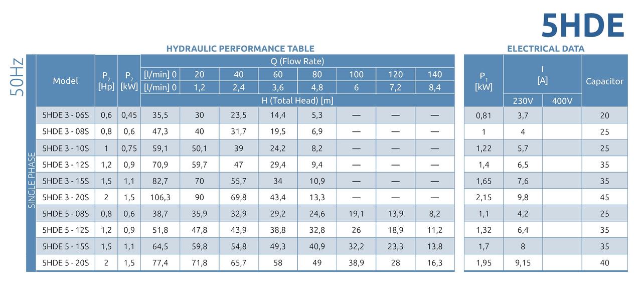 HYDROP 5HDE 5-20S je najvýkonnejšie 5" ponorné čerpadlo v sérii (1,5 kW), určené pre náročné aplikácie s požiadavkou na vysoký prietok (až 140 l/min) a tlak (77 m). Vďaka konštrukcii s vnútorným chladením motora je ideálne pre kopané studne a zberné nádrže, kde nevyžaduje chladiaci plášť. Predstavuje robustné riešenie pre priemysel, poľnohospodárstvo a zásobovanie veľkých objektov.