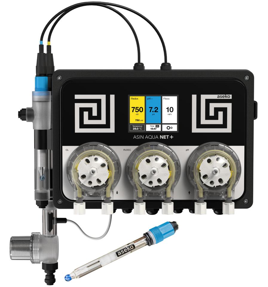ASEKO ASIN AQUA Net+ Dose je kompaktný dávkovací systém pre automatickú úpravu vody v bazénoch do 120 m3. Zariadenie presne reguluje pH pomocou sondy a zabezpečuje časovo riadené dávkovanie dezinfekcie (chlóru) a flokulantu. Vďaka integrovanému internetovému pripojeniu (Net+) umožňuje plný vzdialený monitoring a kontrolu nad kvalitou vody.