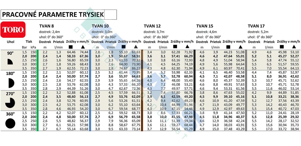 Trysky TVAN (Toro Variable Arc Nozzles) sú navrhnuté tak, aby poskytovali vynikajúcu účinnosť zavlažovania s maximálnou všestrannosťou. S možnosťou plynulého nastavenia uhla od 0° do 360° dokážu presne pokryť akýkoľvek tvar terénu, čím eliminujú potrebu skladovania množstva rôznych fixných trysiek.