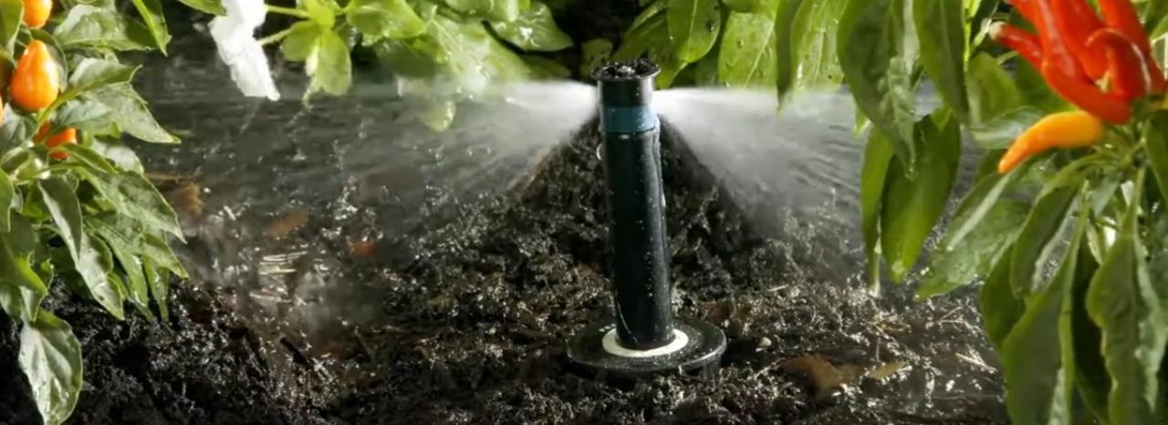 - Líniová výsadba stromov a kríkov, kde tryska umiestnená medzi dvoma rastlinami zavlažuje obe strany súčasne.